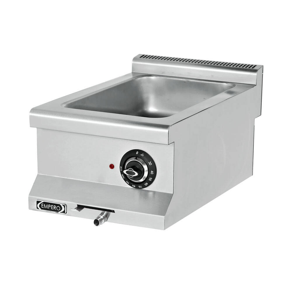 - Termostatik kontrol.- Tahliye musluğu.- Kolay temizlenebilir ve hijyeniktir.- Üst tabla kalınlığı 1.2 mm, gövde 1 mm paslanmaz çelik.EMP.6SE010- Kapasite; 1 adet 2/3 Gn + 2 adet 1/6 Gn