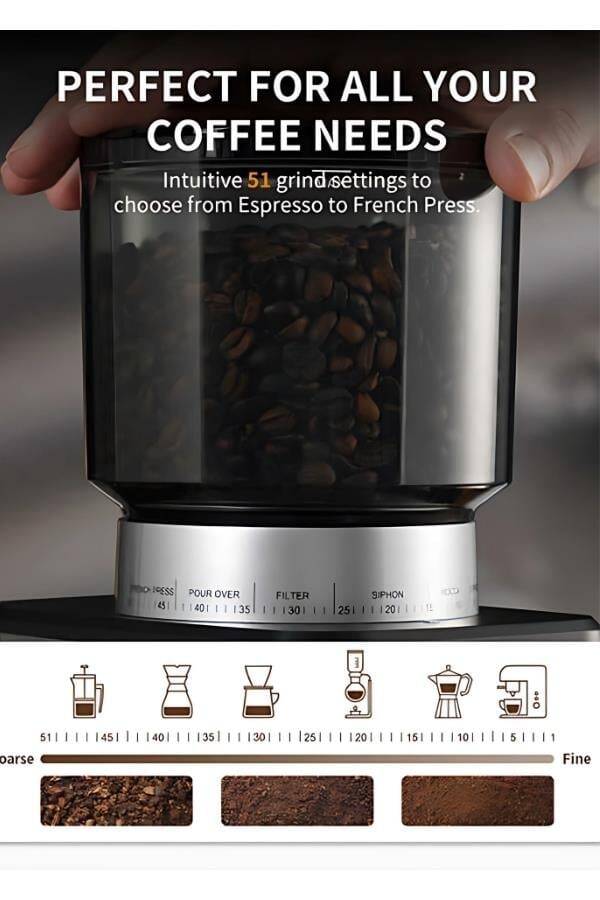 51 seviye öğütme kalınlık incelik ayarı ile her kahve türüne uygun öğütme yapabilirsiniz.